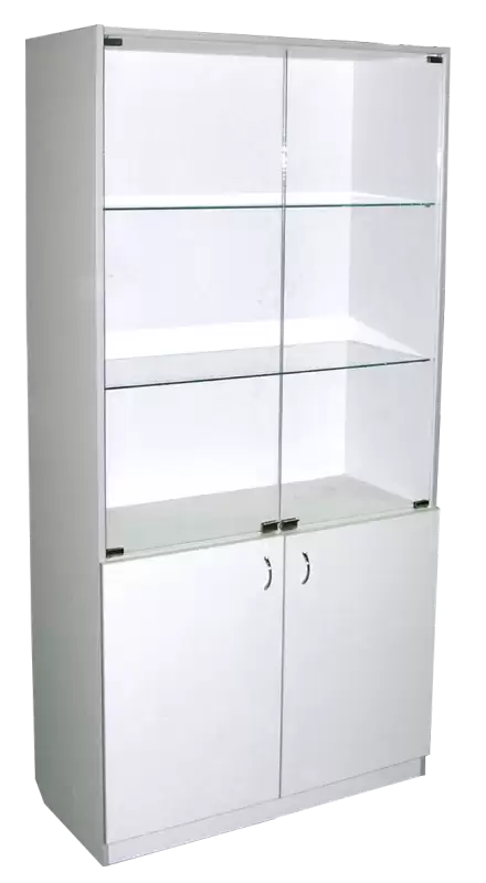- Функциональная конструкция — два отделения: верхнее с двумя стеклянными дверями и двумя стеклянными полками, нижнее с двумя дверями и полкой из ЛДСП.