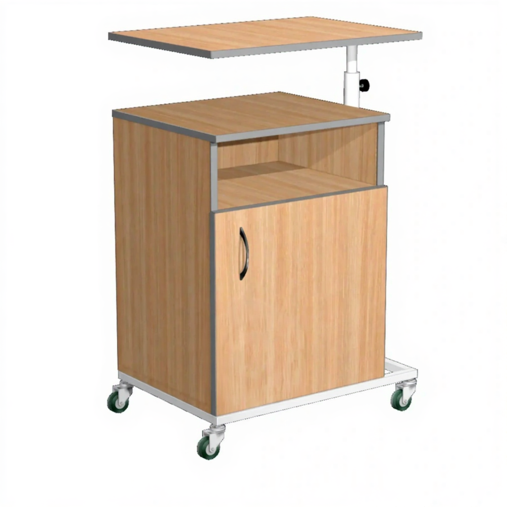 Тумба подкатная ТПМ-5 с надкроватным столиком (ЛДСП дуб молочный, каркас белый) один из самых мобильных и практичных видов медицинской мебели. Предназначена для хранения личных вещей, одежды, документы, а также могут использоваться как приставной элемент мебели у рабочего стола или кровати.