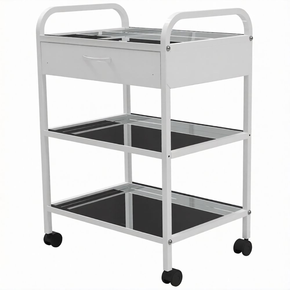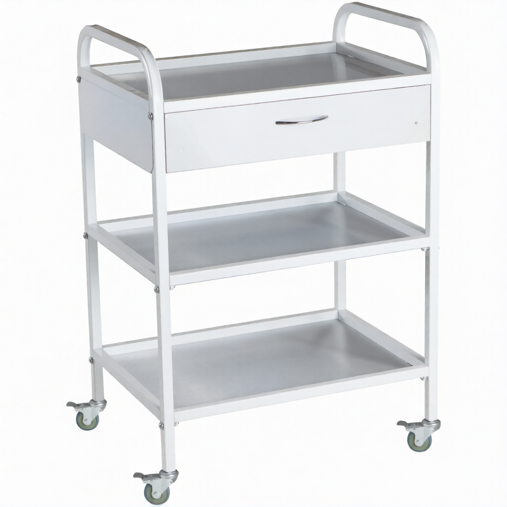 Стол медицинский инструментальный СМИ-03-01 (полки нерж., колёса серая резина) предназначен для размещения инструмента, лекарственных препаратов и приборов.