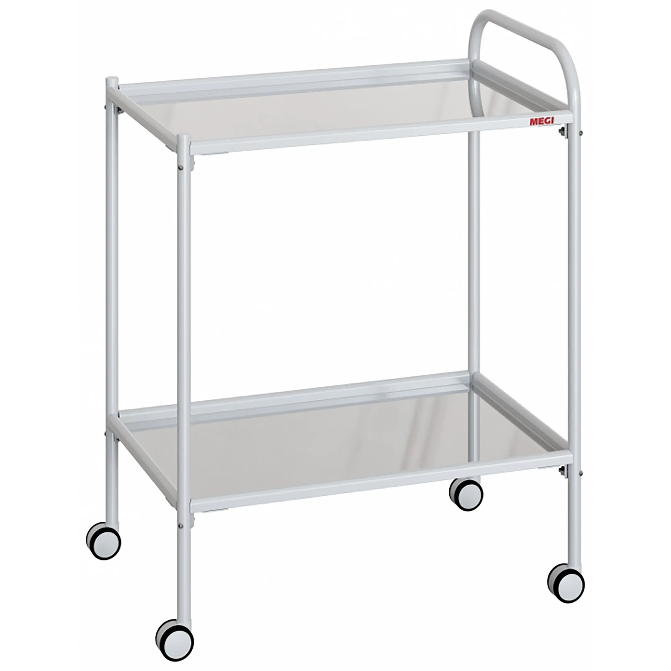 • колеса поворотные, самоориентирующиеся, диаметром 50 мм, комплектуются надёжной стальной вилкой с прецизионным радиально-упорным подшипником, ободом из полипропилена и шинкой из серого полиуретана, не оставляющего следов на полу, два колеса – с индивидуальным тормозным устройством.