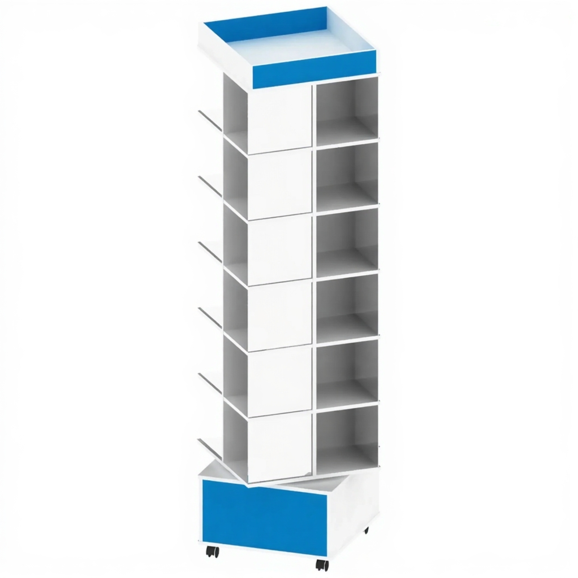 - Полная мобильность и вращение — оснащен колесами и вращающейся платформой, что позволяет легко перемещать и разворачивать стеллаж, обеспечивая доступ ко всем полкам без необходимости обхода.