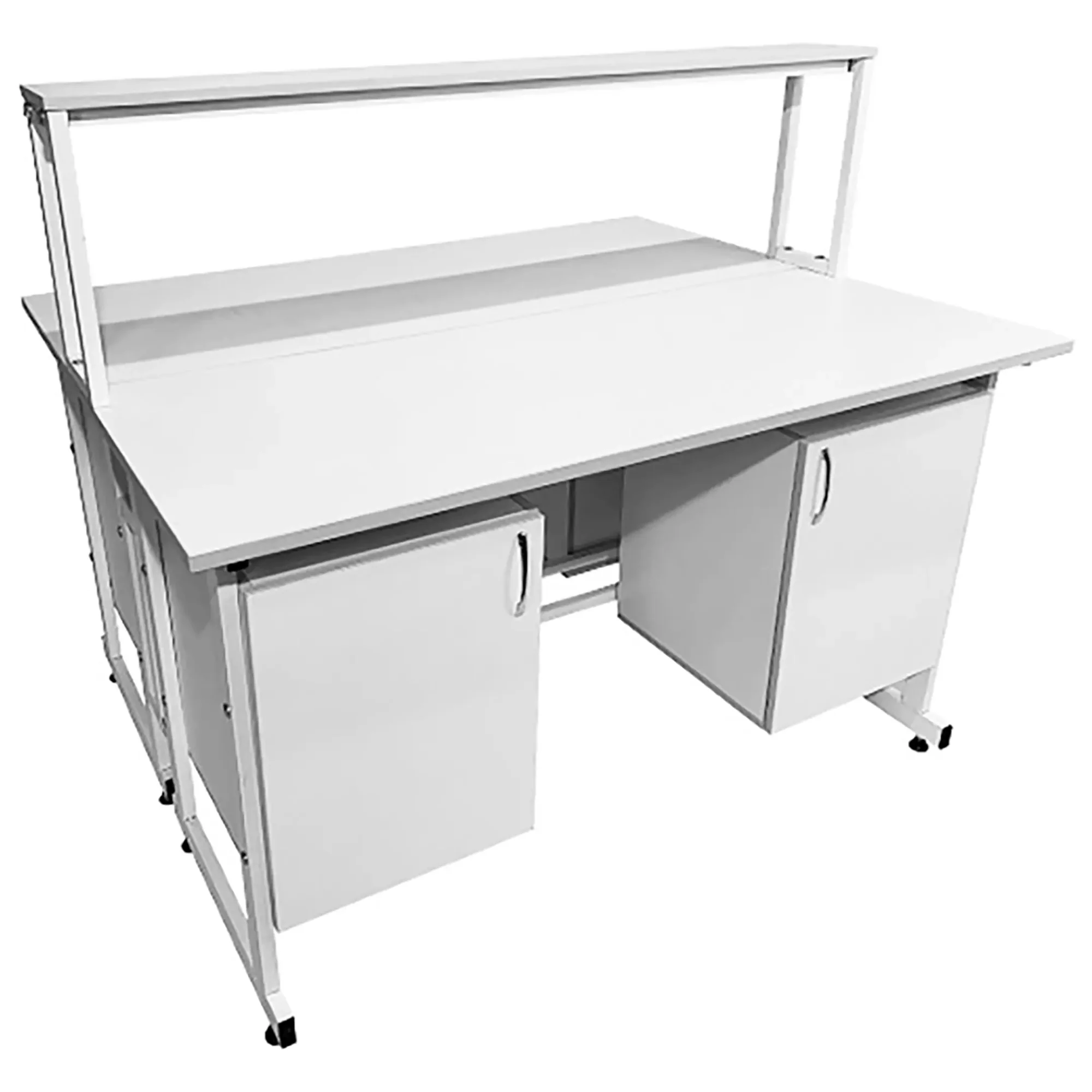 Стол лабораторный островной с надстройкой Сло 22.010 (белый) — это универсальное и функциональное решение для создания двух полноценных рабочих мест, специально разработанное для использования в лабораториях и медицинских учреждениях. Модель оснащена двумя рабочими местами, каждое с двумя подвесными тумбами с распашными дверками и полками, а также центральной надстройкой с одной полкой. Каркас выполнен из стального профиля, столешницы из ЛДСП толщиной 22 мм.