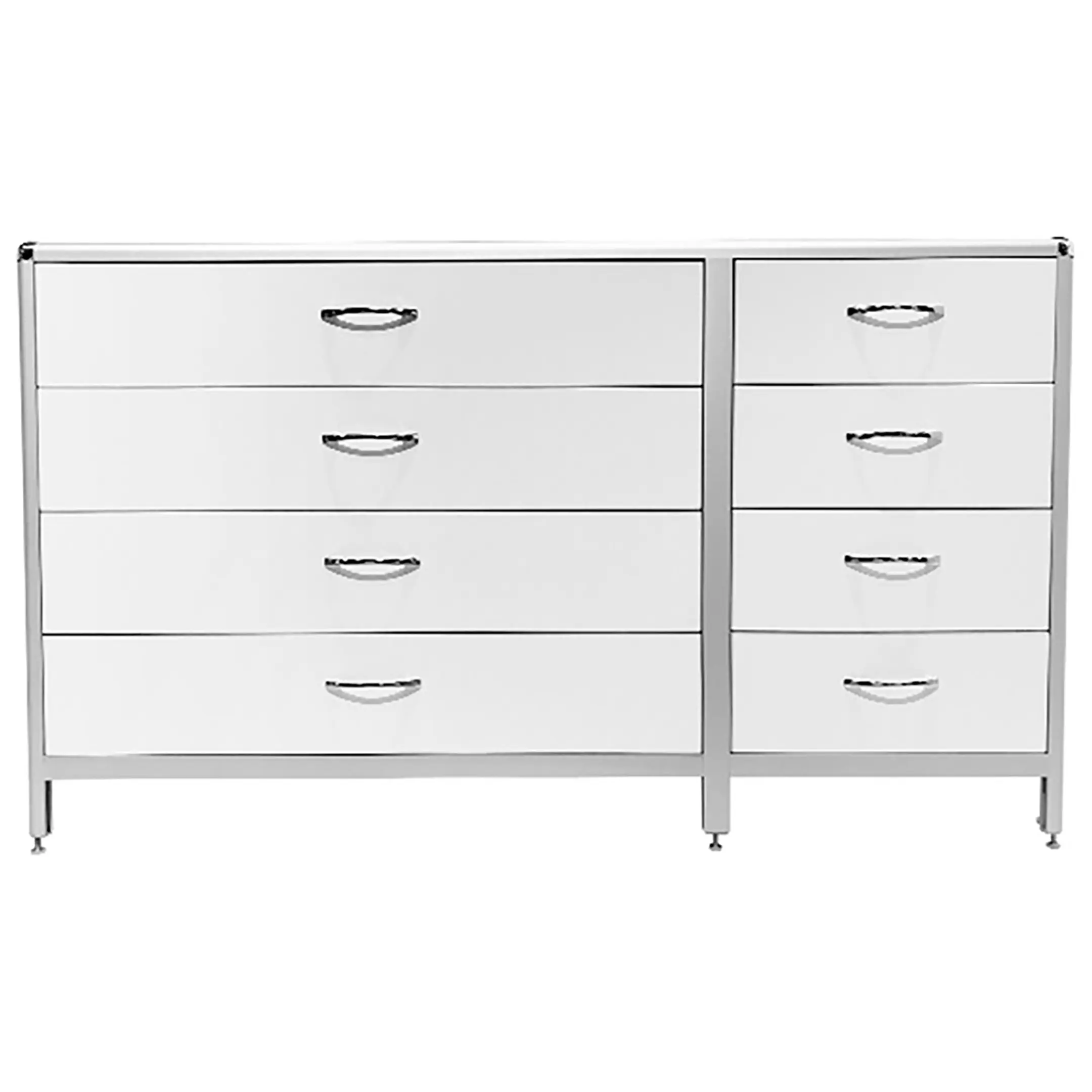 Стол-тумба лабораторная MED 12.016al (белый) — это функциональное решение для хранения лабораторного инвентаря, приборов и материалов в лабораториях и медицинских учреждениях. Модель разделена на два вертикальных отдела (большой и маленький), каждый из которых оснащен четырьмя выдвижными ящиками. Каркас выполнен из алюминиевого профиля, столешница из ЛДСП толщиной 16 мм.