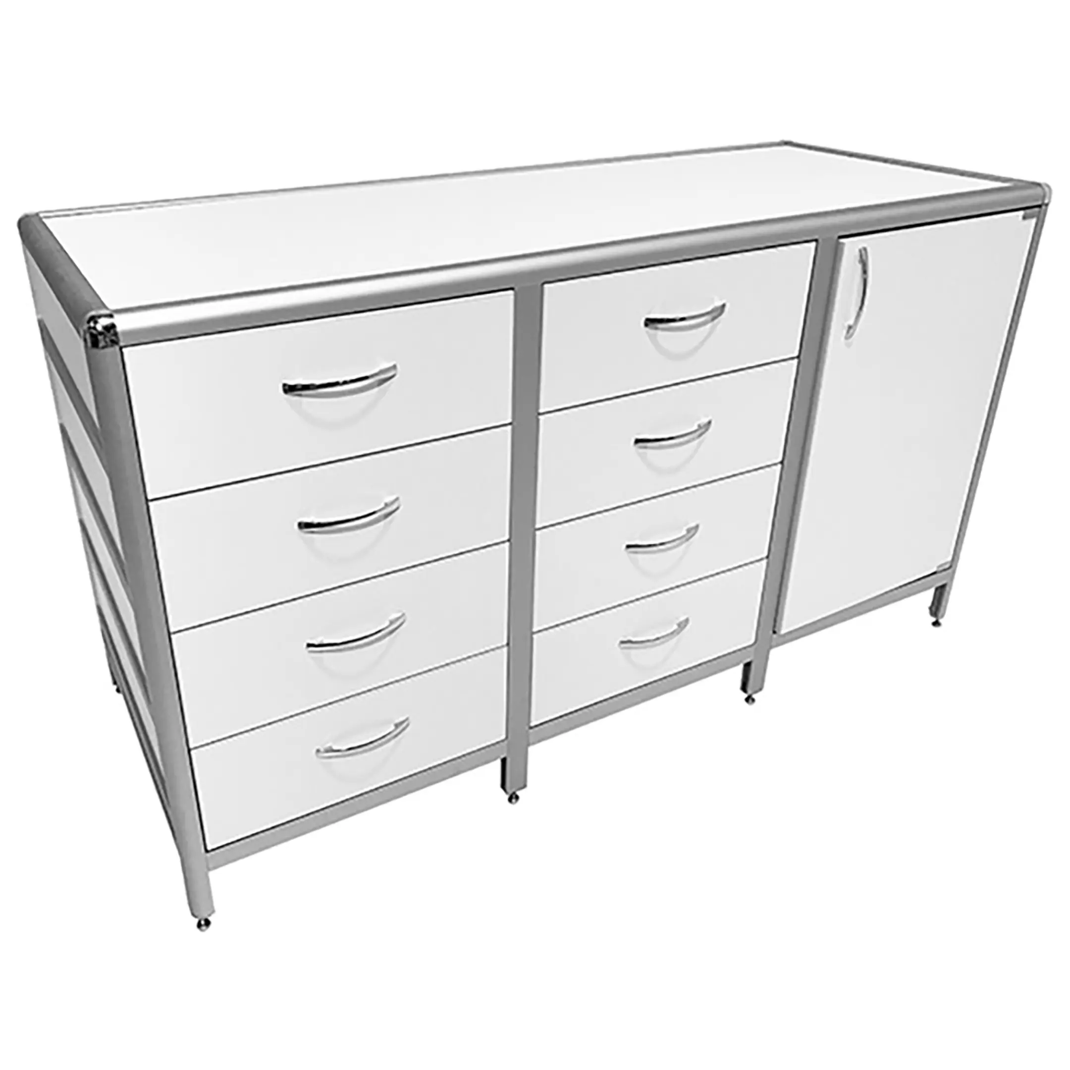 Стол-тумба лабораторная MED 12.022al (белый) — это функциональное решение для хранения лабораторного инвентаря, приборов и материалов в лабораториях и медицинских учреждениях. Модель разделена на три отдела: один с распашной дверкой и полкой, два других с восемью выдвижными ящиками. Каркас выполнен из алюминиевого профиля, столешница из ЛДСП толщиной 16 мм.