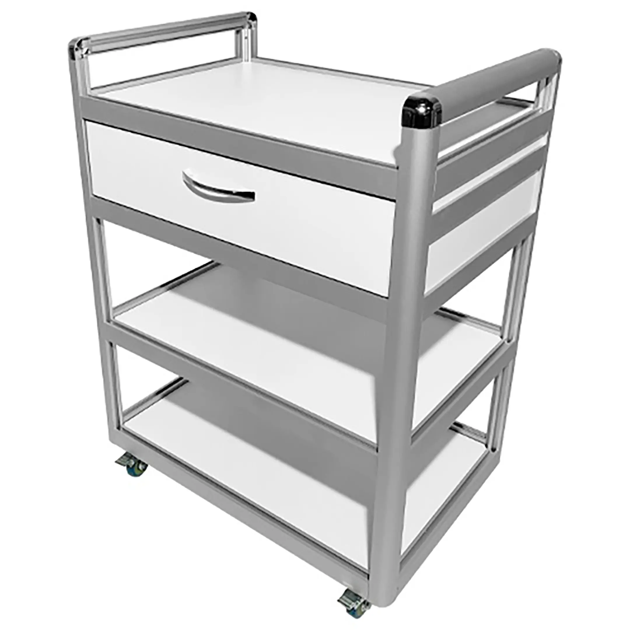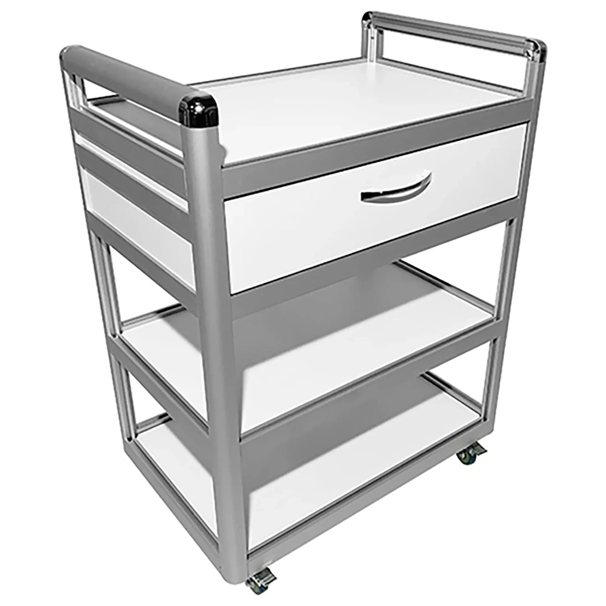 Столик лабораторный подкатной MED 14.002al (белый) — это удобное и надежное решение для временного размещения и удобного перемещения инструментов, предметов и приборов в медицинских учреждениях и лабораториях. Модель оснащена столешницей, нижними полками, выдвижным ящиком и колесными опорами. Каркас выполнен из алюминиевого профиля, столешница из ЛДСП.