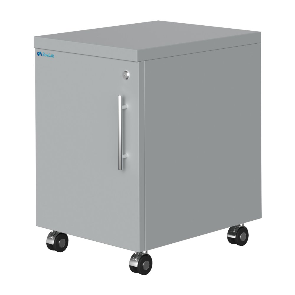 - Мобильность и компактность — колесные опоры диаметром 50 мм позволяют легко перемещать тумбу, оптимальные габариты для размещения в любом месте лаборатории.