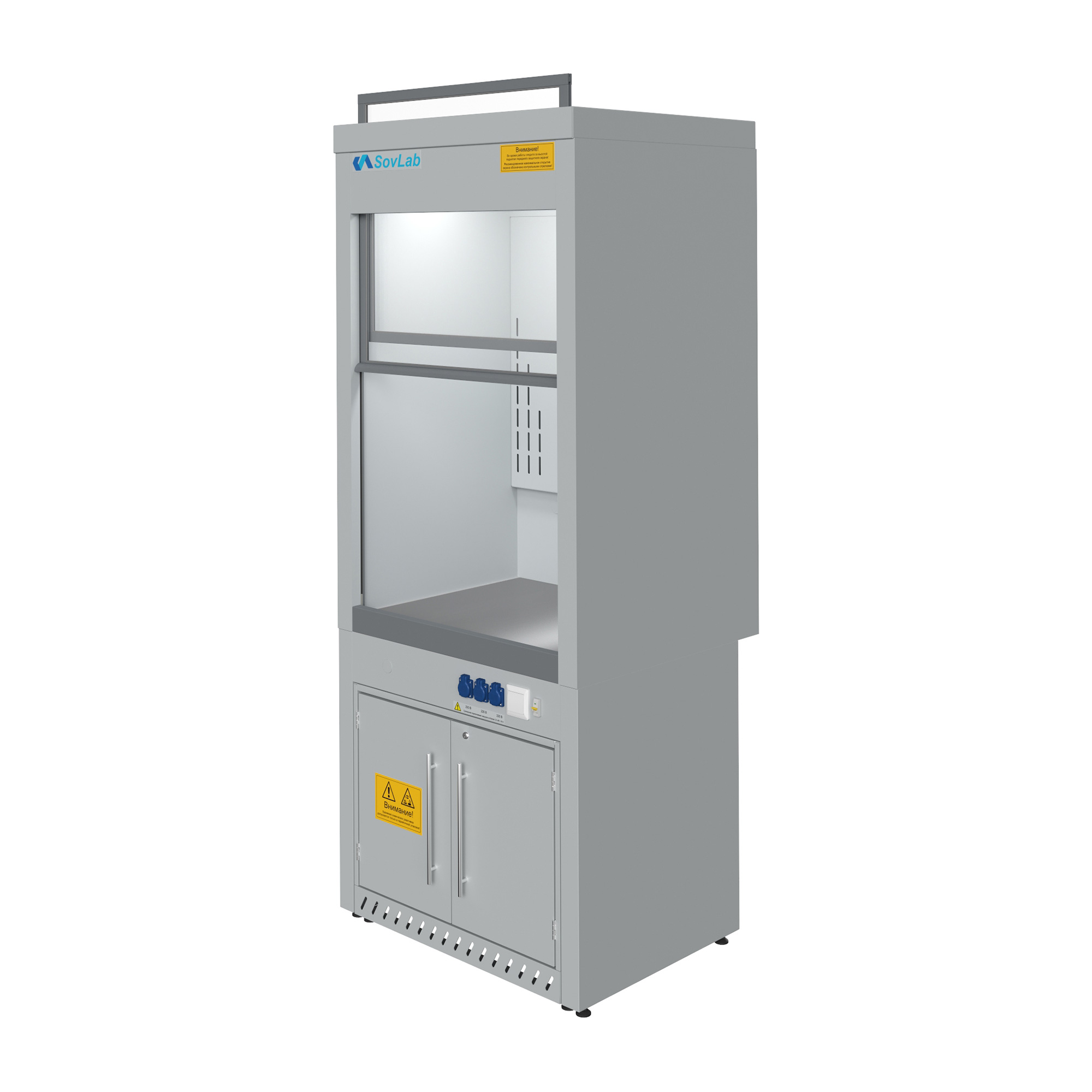 - Безопасная работа с летучими веществами — вертикально-подъемный защитный экран из ударопрочного стекла с системой противовесов для плавного хода и фиксации.
