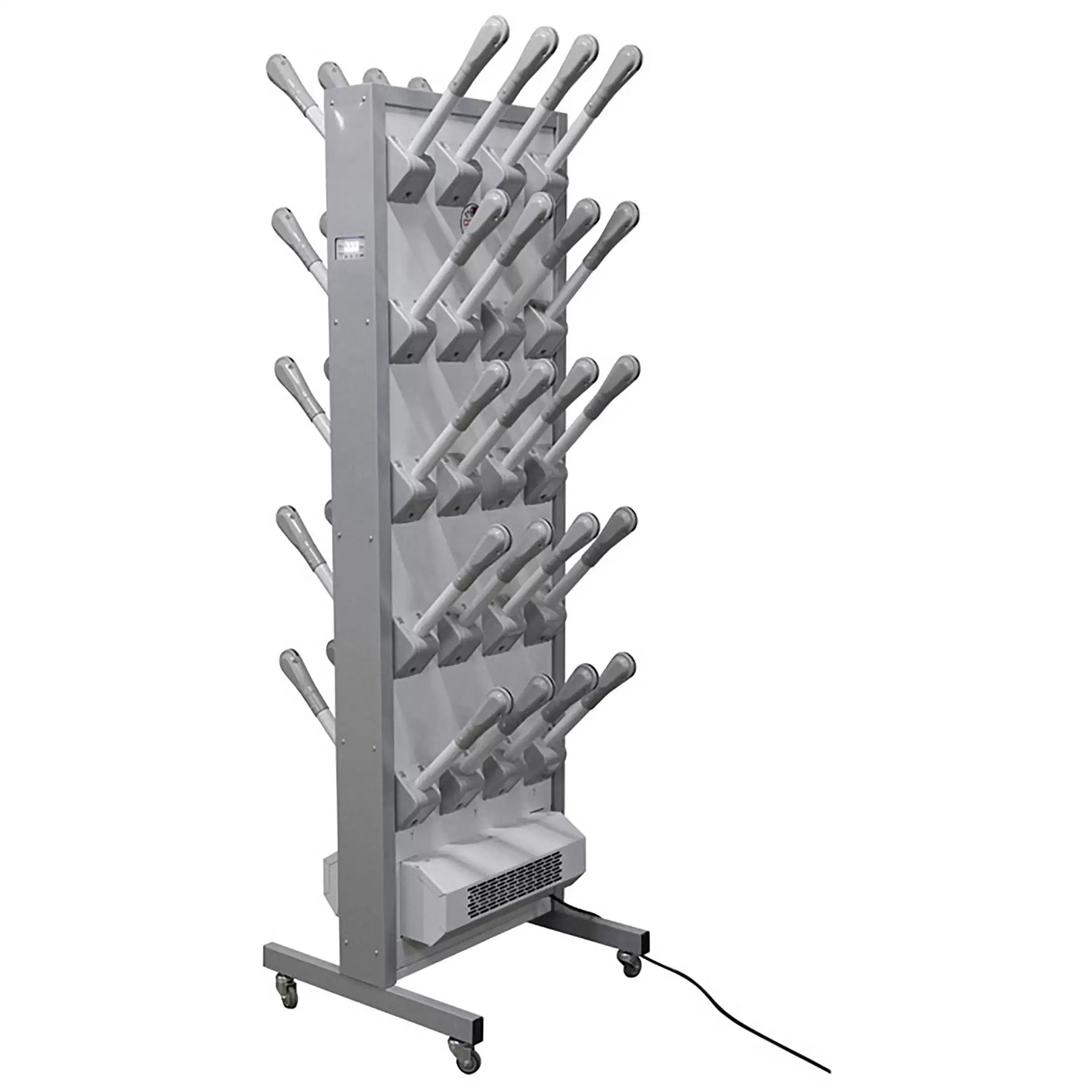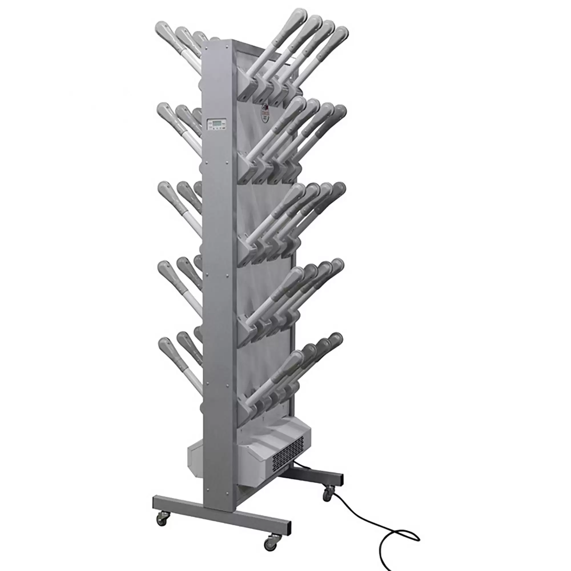 - Компактность и автономность — комплект с подставкой представляет собой готовое к использованию решение, не требующее сложного монтажа. Его можно легко установить в любом удобном месте раздевалки, коридора или подсобного помещения и при необходимости переместить.