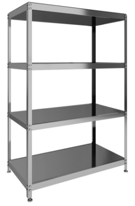 Стеллаж кухонный, 4 сплошные полки выполненные из нерж. стали марки AISI 430, толщина,8 мм; каркас разборный, уголок из нержавеющей стали AISI 430 1,5 мм толщиной.
