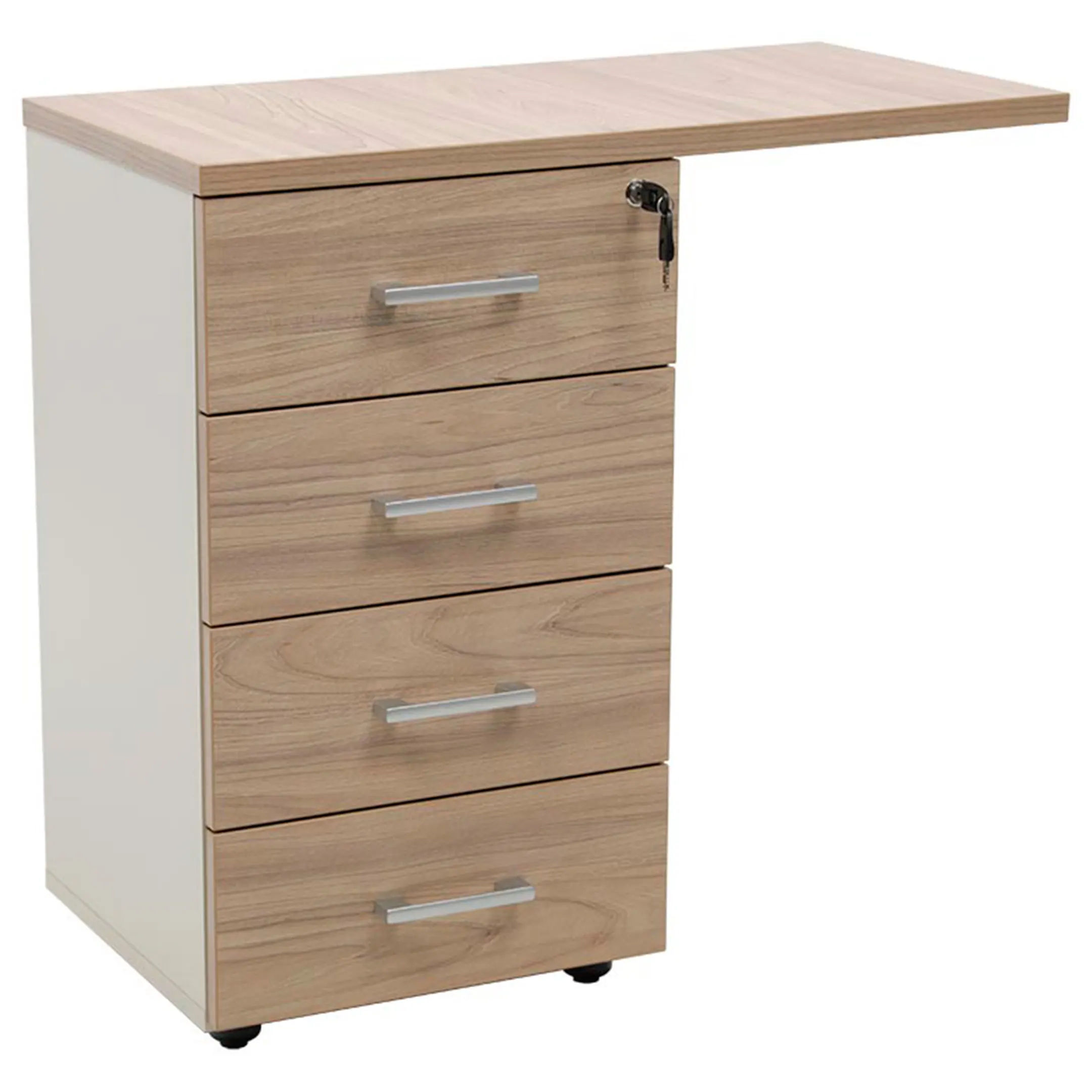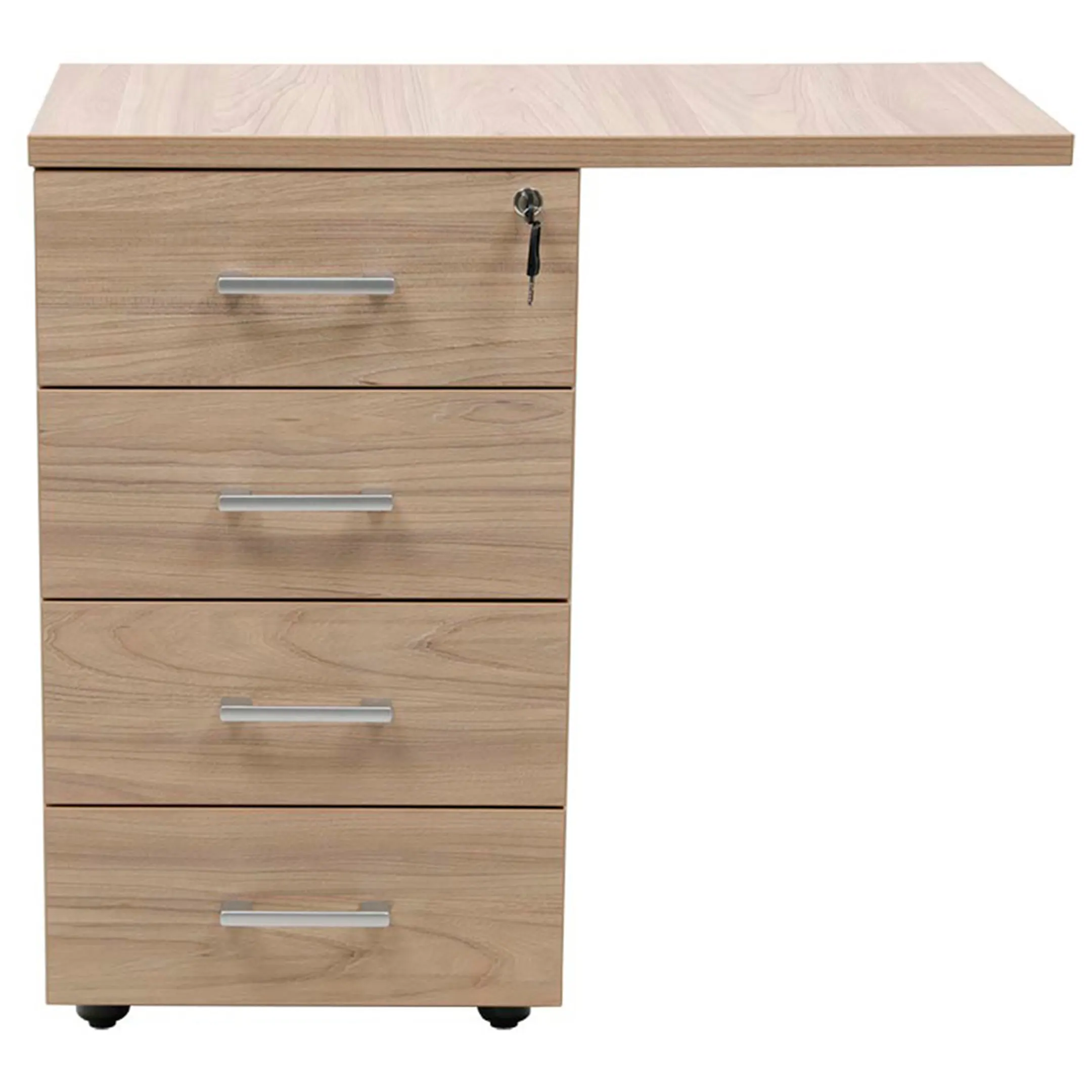 • Тумба снабжена центральным замком и оснащена пластмассовым лотком для канцелярских принадлежностей в верхнем ящике.