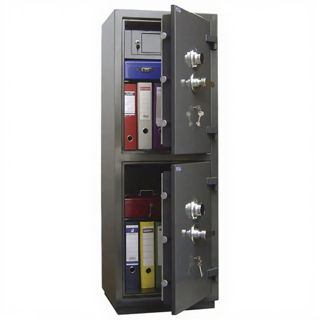 • Каждая дверь сейфа оборудована запорным механизмомс 2-х сторонней ригельной системой запирания (по 3 ригеля Ø28 мм вправо/влево), который блокируется ключевым сейфовым замком класса «А» фирмы «CAWI» или «MAUER» производства Германии, дополнительно к ключевому замку оборудован механическим кодовым замком фирмы «CAWI»;